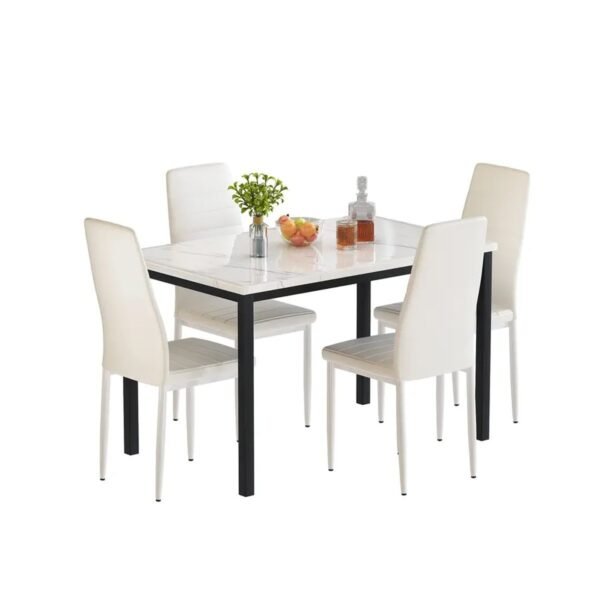 Upgrade your dining experience with the Lamerge Modern 5-Piece Dining Table Set. Featuring a sophisticated faux marble countertop, this classic set includes four beige faux leather upholstered chairs for optimal comfort and style. Crafted with a durable metal frame, the set is designed to withstand daily use while enhancing your kitchen, breakfast area, or dining room. The mixed-color palette adds a modern yet timeless appeal to any interior. With no need for electricity, this energy-efficient dining set perfectly combines elegance, durability, and practicality for both everyday meals and special occasions.