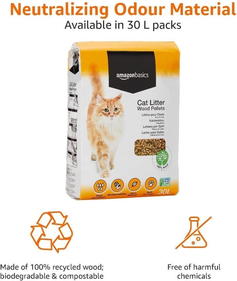 - 30 Litre Pack: Highly absorbent Amazon Basics cat litter wood pellets; absorb over 2X of own weight in liquid