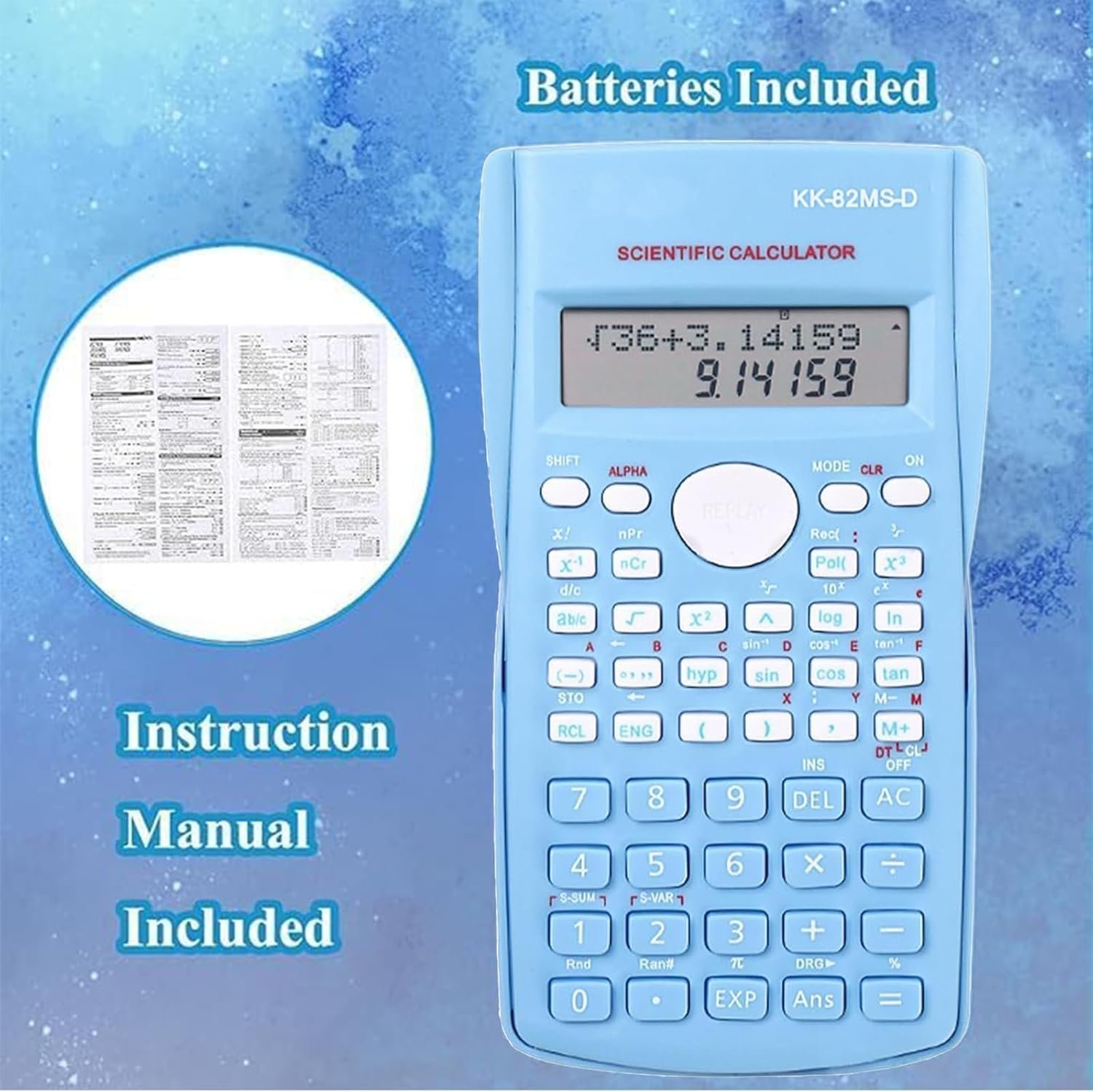 - Package includes: 1X Scientific Calculator(batteries included), a piece of instruction