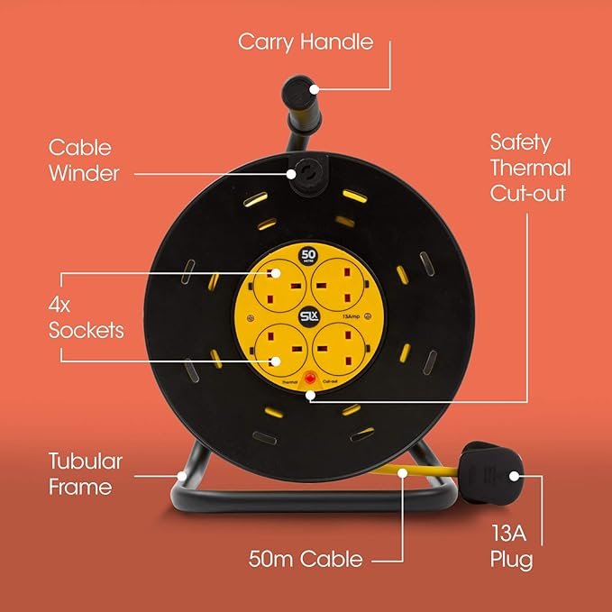 - ✔️ STAY TANGLE FREE: With its attached winding handle and robust design, this power cable reel keeps your lead ready for action. The extra-long 50m cable reel can be fully unwound in seconds, and when you are finished it can be simply wound back without tangling with a built in cable guide to assist the reel process. The durable metal frame features a convenient carry handle for easier transportation, while the wide base offers stability while stood up.